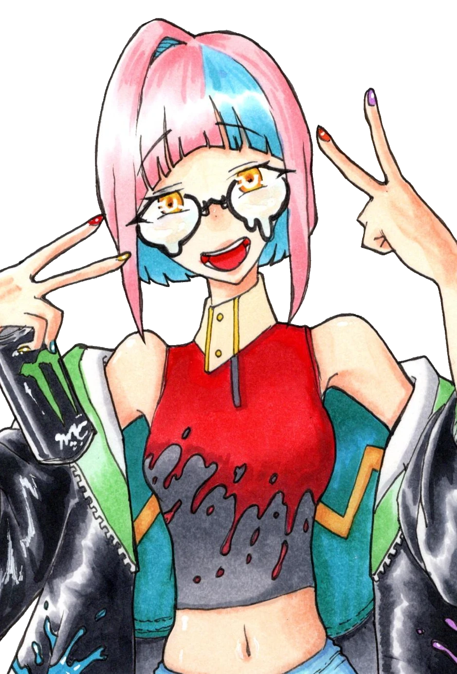 頭のてっぺんから爪の先までビビッドな色合いで染めた一風変わった女性で、アイドル兼ストリーマーを生業にしている。