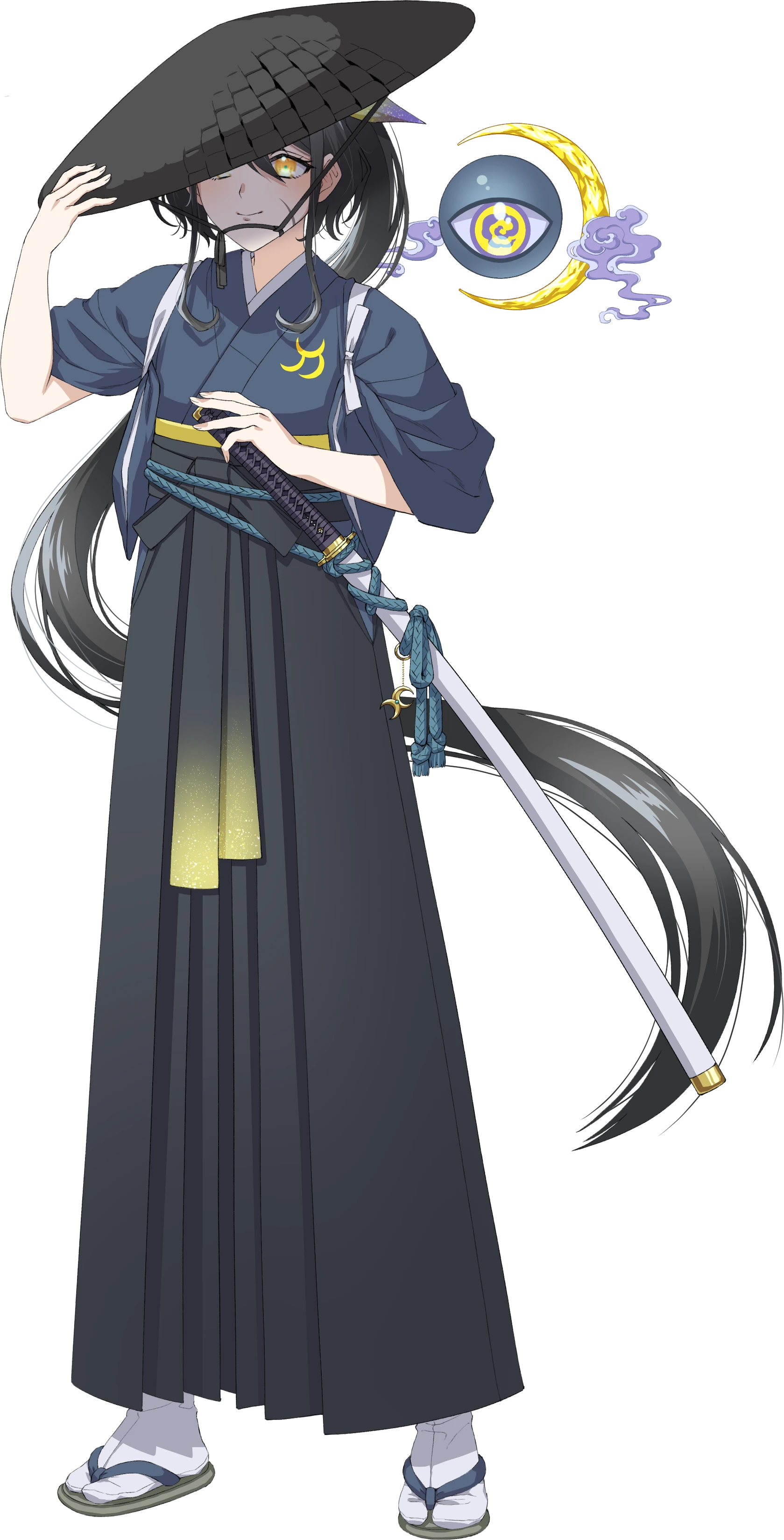 垂れ目と艶やかな黒髪がチャームポイント。顔の傷は兄と共に立ち向かったときの名誉の負傷。刀と月のマークが入った、和風なコスチュームや遺産の編み笠を身に纏っている。