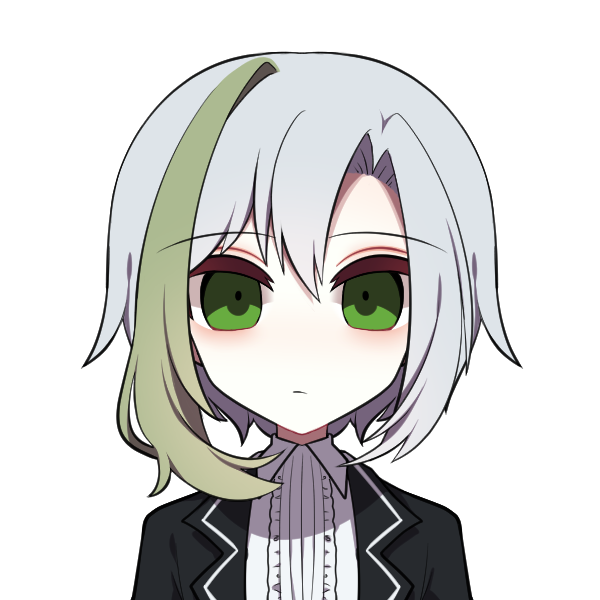見た目:燕尾服或いはスーツ、灰色の髪、緑エクステ、緑の目、低身長