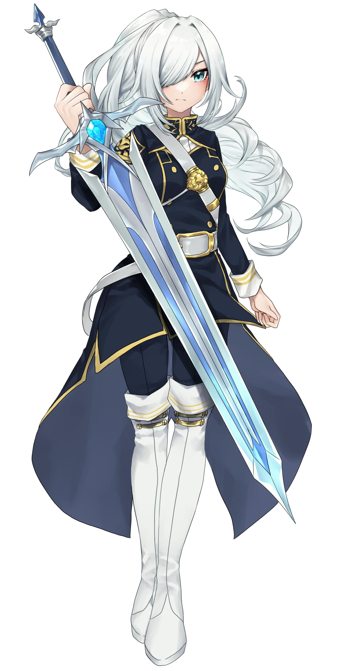 隊服の上に靡く白いマントに身を包む、聖剣を携えた女性。