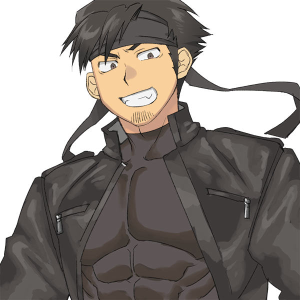 黒髪の隻腕。がっしりとしており、黒いバンダナをしている。