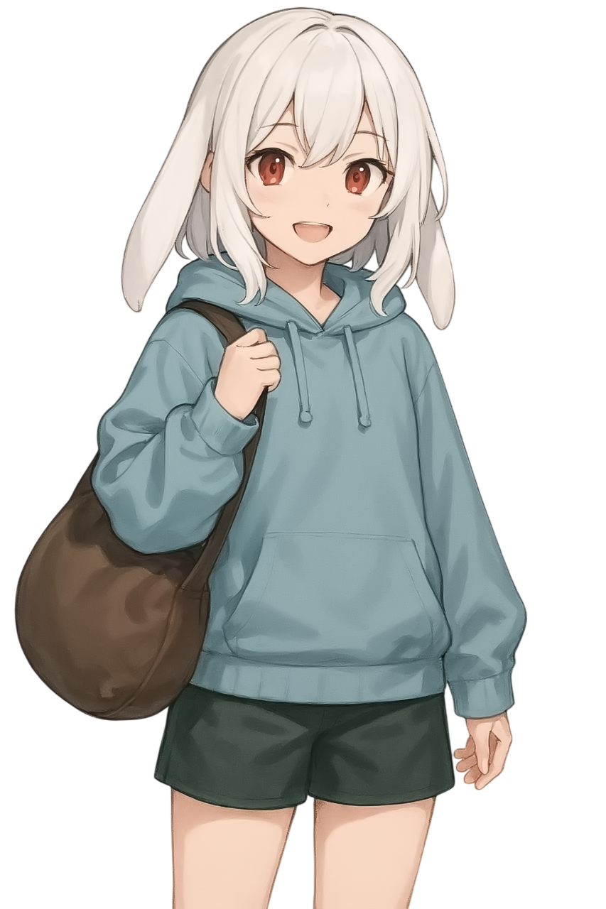 大きな兎の耳付きフードを被った、短い白髪で紅眼の細身の少女。に一見するとみえる。