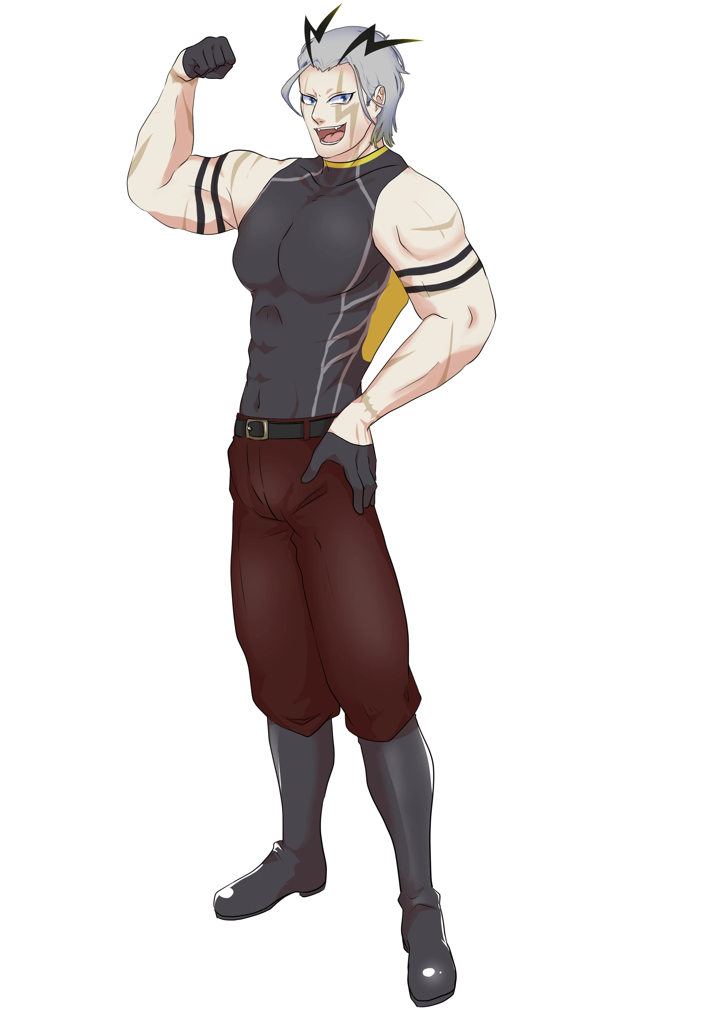 灰がかった髪をオールバックにしている。ガタイは良く、豪胆な笑みを浮かべている。体に稲妻のような痕がある。