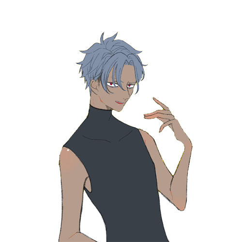 褐色肌に緋色の瞳、青色の頭髪をしている。