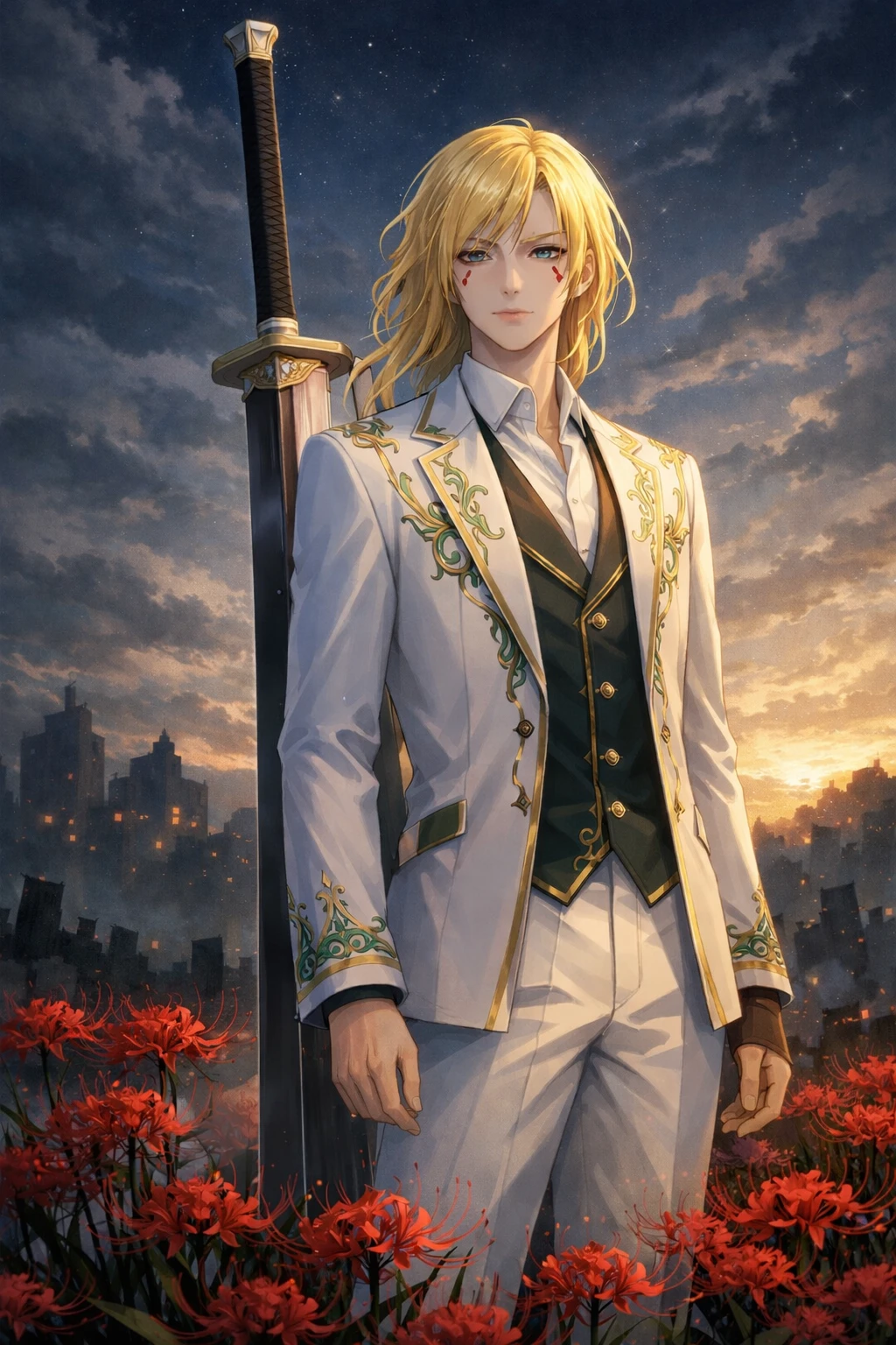長い金の髪、穏やかな笑みを称えた切れ長の目、服は白と翡翠色、金の縁取りを軸とした美しい服