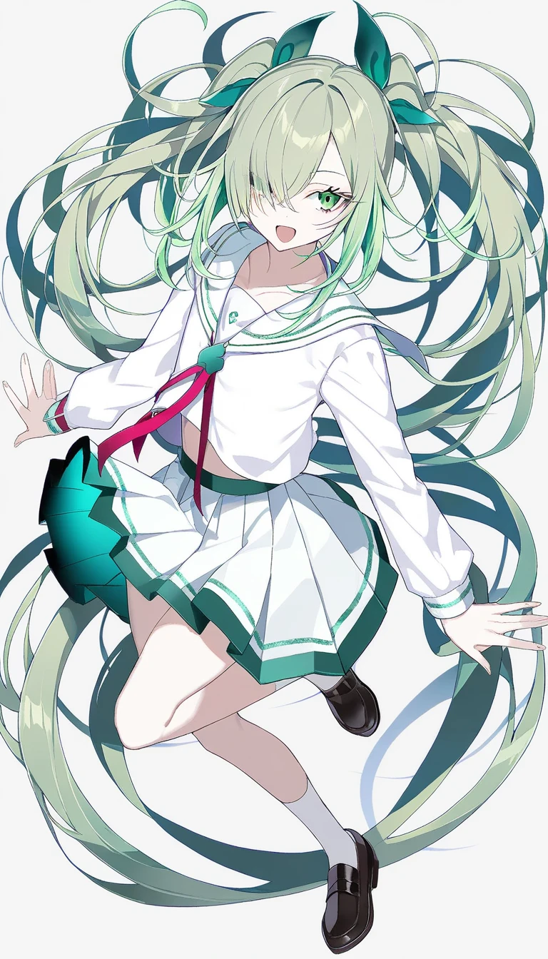 緑髪と緑目にウェーブがかったツインテール。左目隠れ。