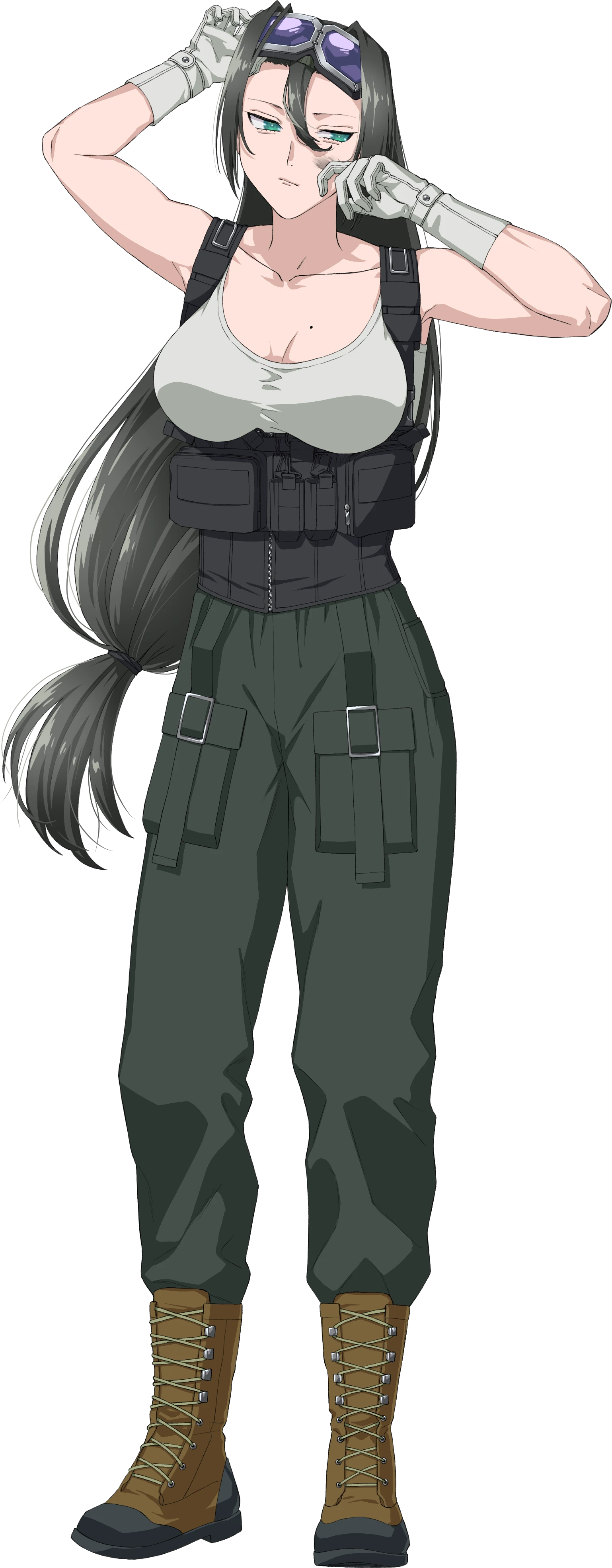 ・髪の色は黒髪で長髪。瞳は碧眼で釣り目。服装はタンクトップにチェストリグとカーゴパンツを身に着けている。