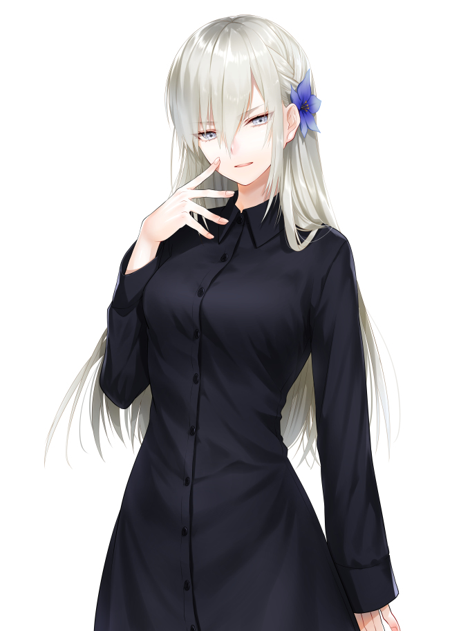 服装は黒の物を好んで着ており、頭にはワンポイントとして青い花の装飾をつけている。