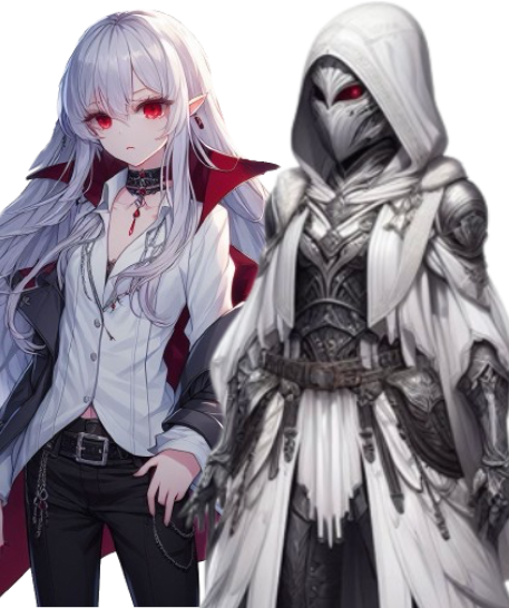 全身を鎧やマントで覆い隠したダンピールの少女。正体を隠すべく仮面を外すことは決して無く、性別も素性も明かしていない。加えて日中は体調が優れず陰気な雰囲気を漂わせていることから周囲から不気味がられている。母は公爵家の血を引く者であり、装備は秘かに家を出る以前に買い与えられた物。性能は勿論細部に至るまで精巧な装飾が施されている。15の歳で屋敷を飛び出して冒険者となる。監禁状態の家庭環境だったため、世間知らずな振る舞いをしがちであり、余計に人から避けられる要因となっている。