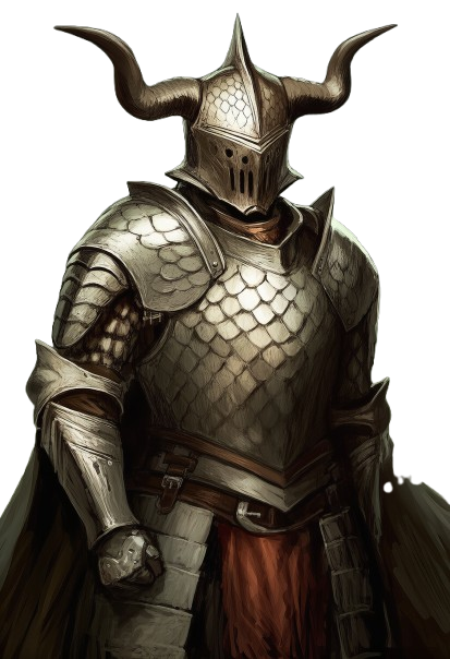 竜燐のついた胴鎧に双角の兜を着用し、重装の軍馬に騎乗し大振りの戦斧で武装し重装騎士。それを脱ぐと鍛え抜かれた筋骨隆々の巨躯が現れる