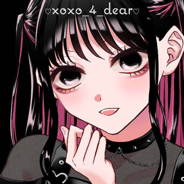 黒髪ハーフツイン、肩甲骨あたりまで伸びる黒髪。内をピンクに染めている。