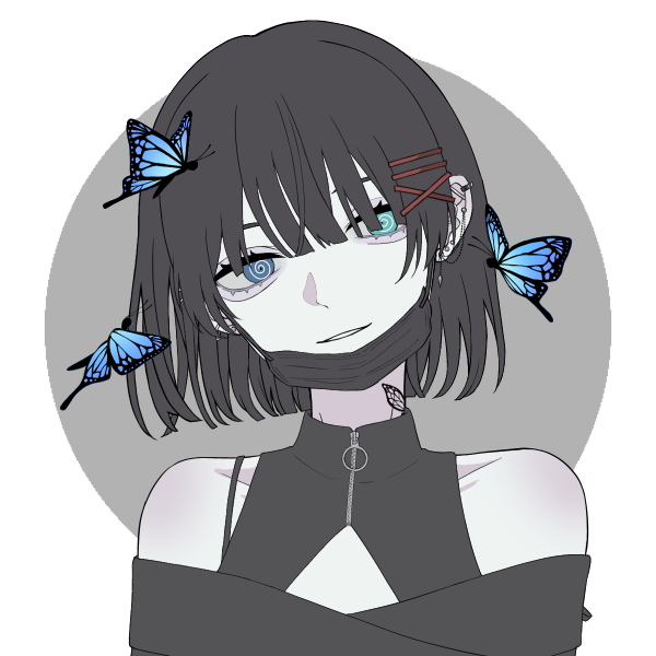 | 外見の特徴 | 黒髪、左右違う青色のオッドアイ、首に蝶のタトゥー | ||