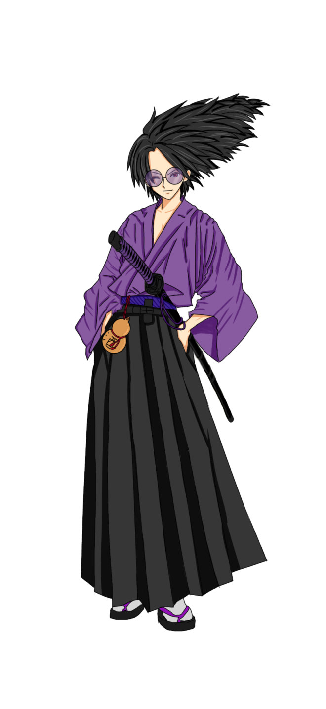 見た目:和服に帯刀、長い頭に大きな色眼鏡をかけている。