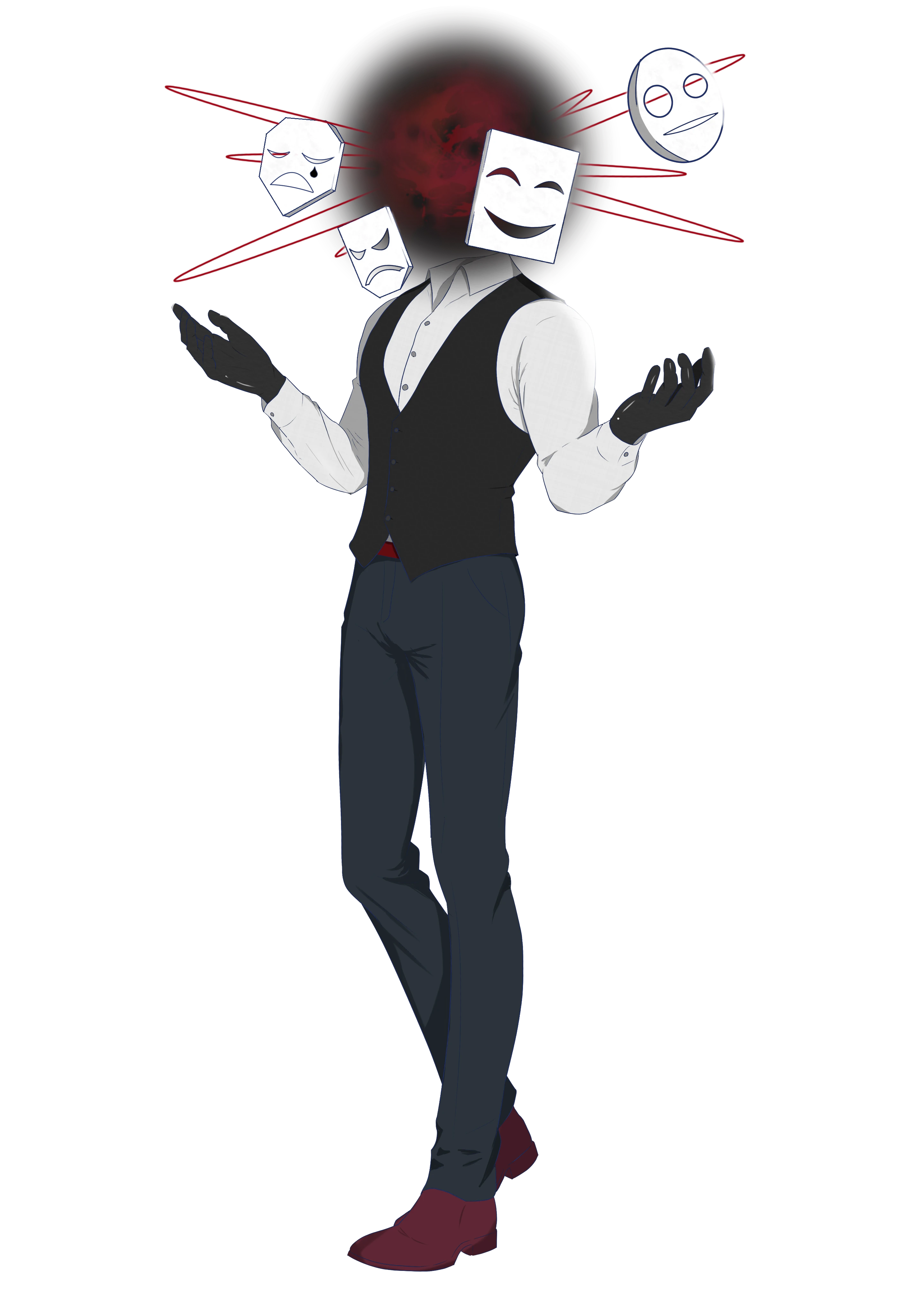ただし頭部に当たる部分には宙に浮いた黒い球体がありその周りを喜怒哀楽4つの仮面が天体のように飛んでいる。