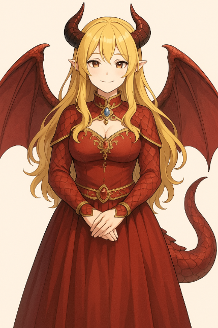 竜の特徴を持つ女性。頭にはねじれた角が生え、腕と足、背中の一部は鱗に覆われている。