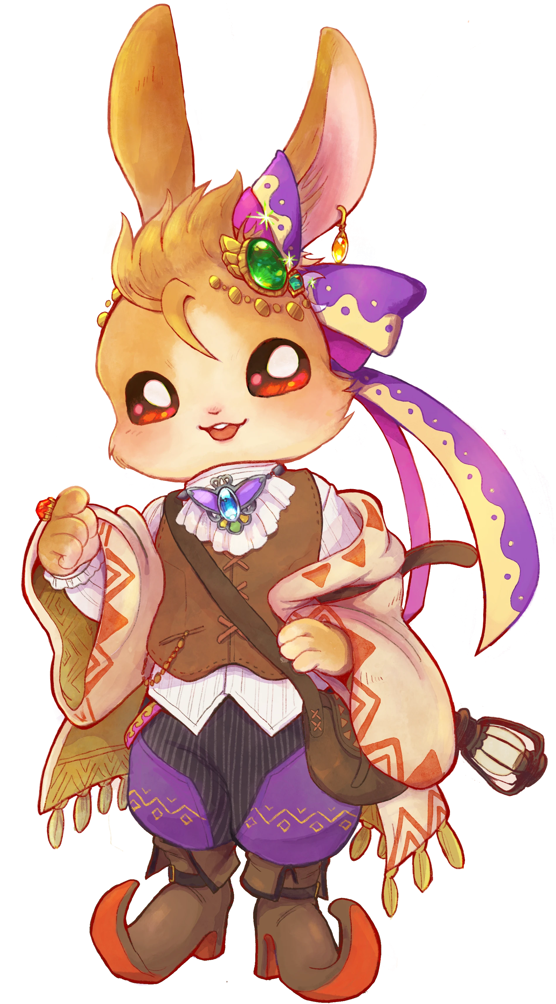 黄金色のやわらかな毛と派手な柄のリボンが特徴のタビットの青年。