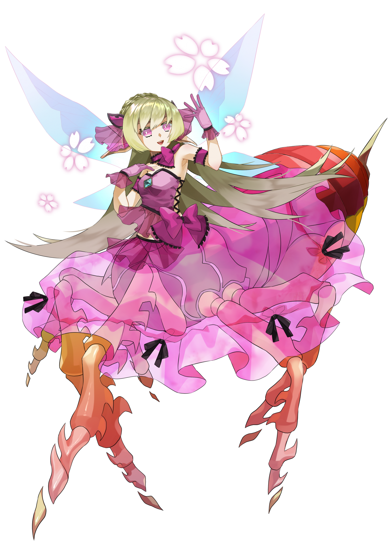 元となった妖精に似通った姿を持ち、装備品が変化します。ラーロの場合、[部位:足]に装飾品を装備することができず、生来武器としてBランク格闘武器<鋭い脚>を持ちます。≪武器習熟/格闘A≫≪武器習熟/格闘S≫または≪武器の達人≫を習得した場合、6レベルでAランク、11レベルでSランクになります。装備のデータはSランクのものです。