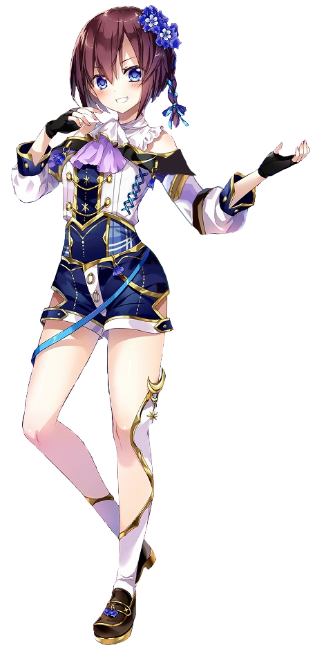 容姿:髪色[赤紫]・瞳の色[青]・肌の色[肌色]・身長[162cm]・体重[48kg]・その他[片三つ編み]
