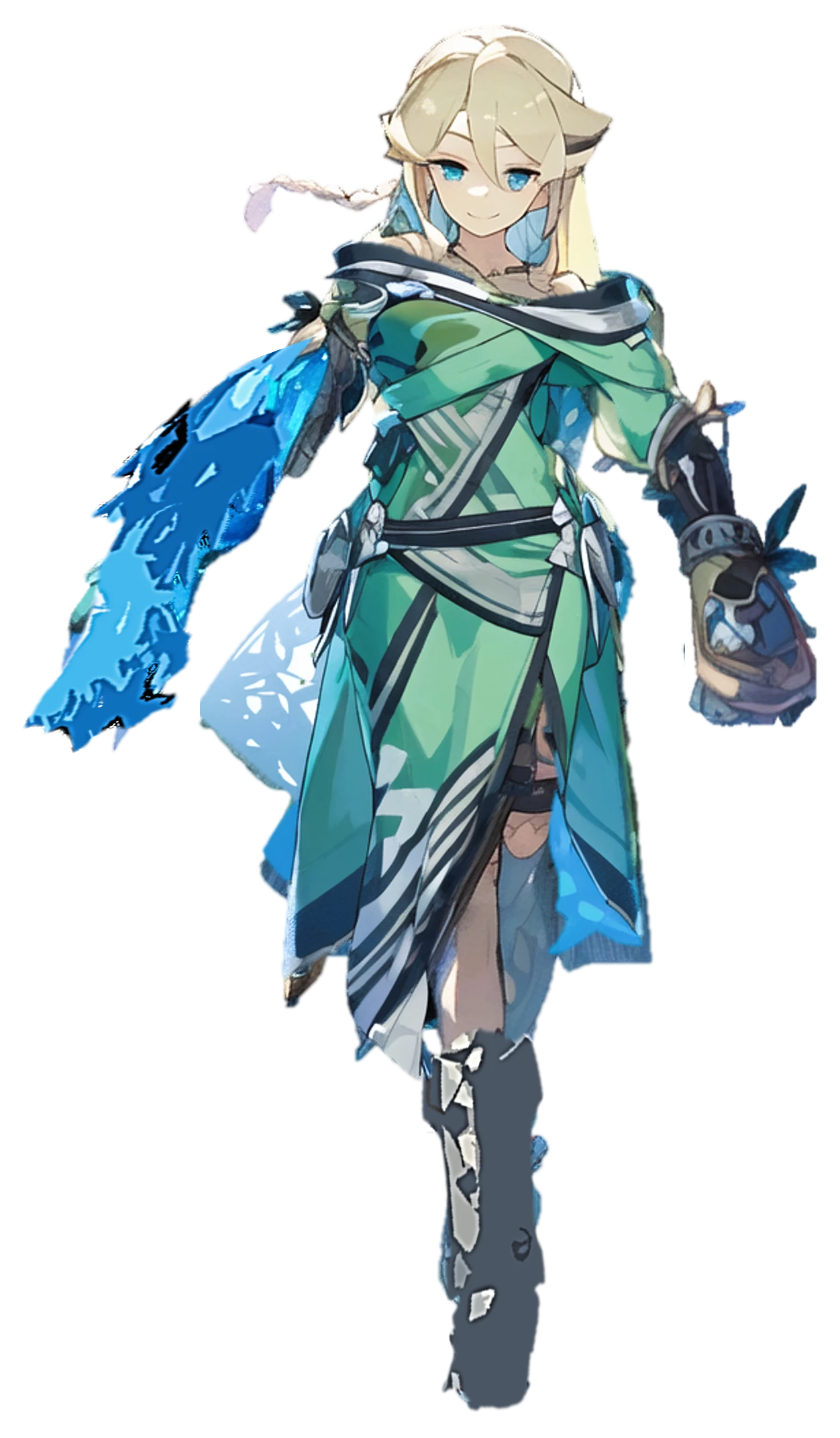 金髪のエルフらしい外見をしているが、右手が水棲蛮族の外殻のように変形しており、鋭い爪と硬い甲殻を格闘武器のように扱える。