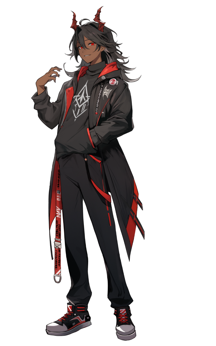 浅黒い肌、黒い髪、赤い瞳、小さな赤い角