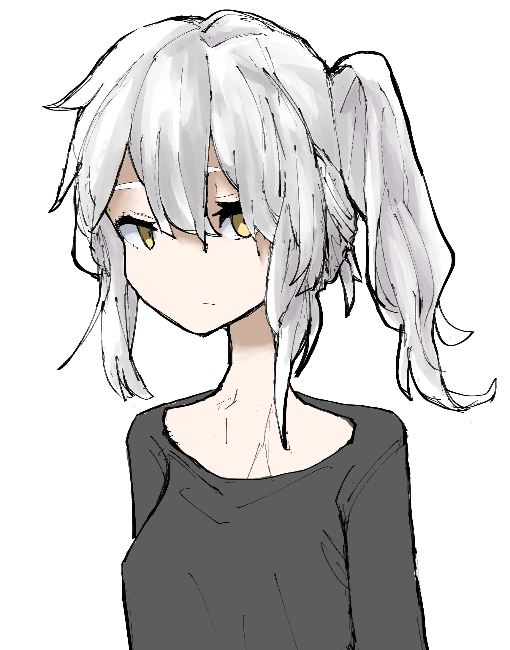 151cm、38kg、白いサイドテール、山吹色の瞳、ドス黒い茶紫色の左手、革装備