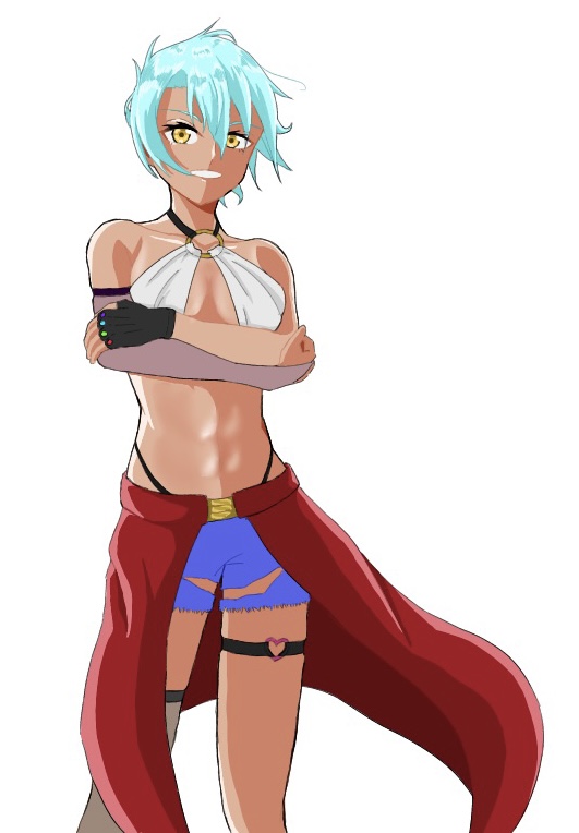 褐色 青髪 金色の眼