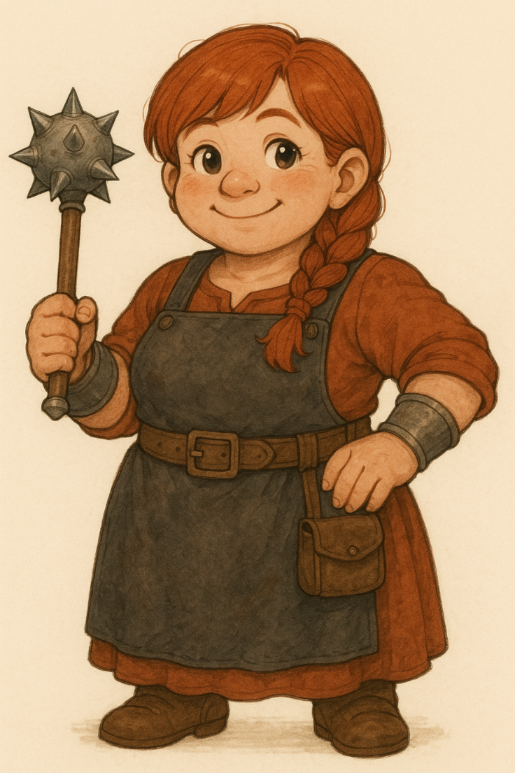 赤毛で背の低いドワーフのおばちゃん。