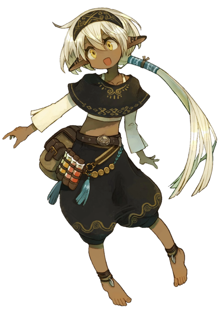淡い色の髪と褐色の肌、そしてキラキラ輝く瞳がトレードマークのエルフの少女。