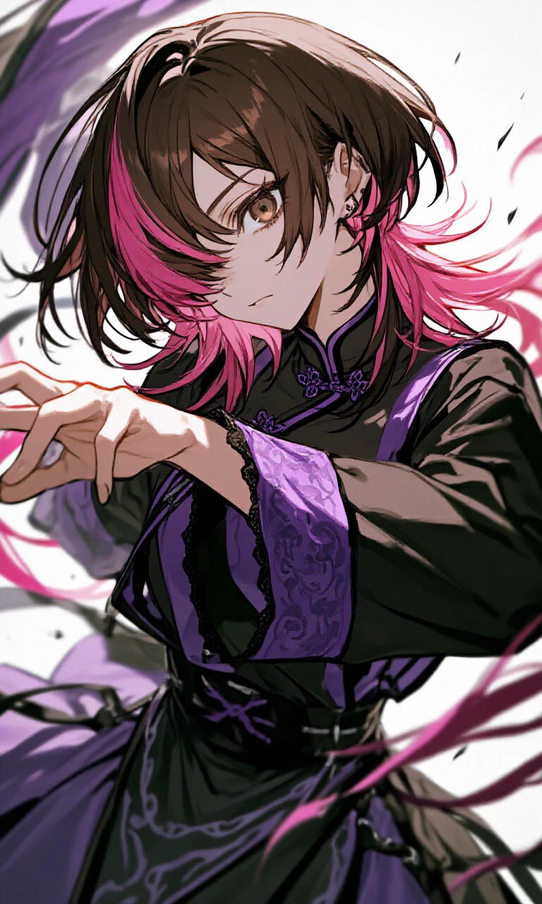 - 茶色の髪にピンクのメッシュ、茶の目を持つ