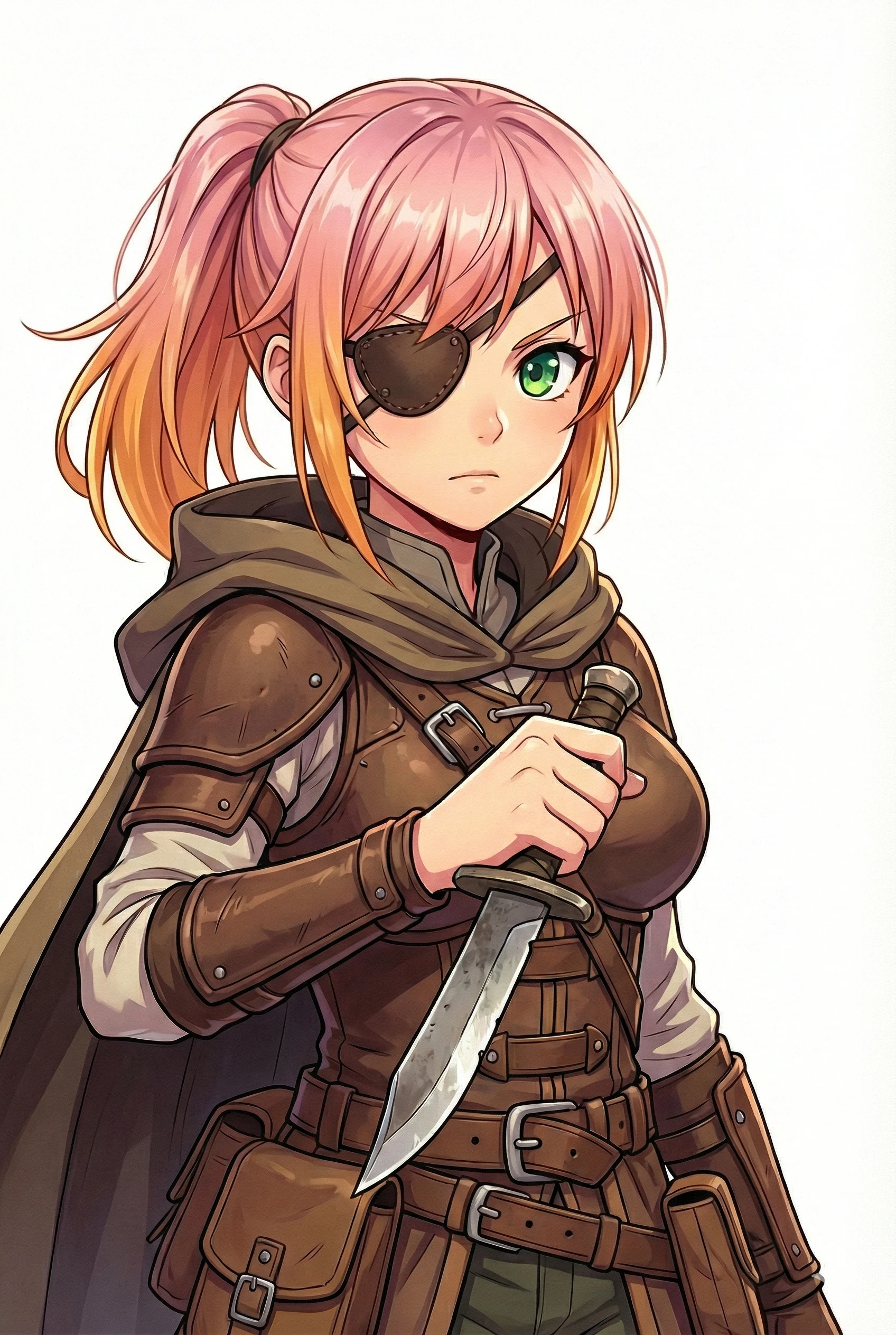 ピンクとオレンジのグラデ髪をポニーテールにした、緑眼の少女。