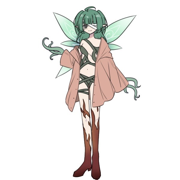 容姿:緑の髪に顔にできた火傷後と眼に巻いた包帯が特徴的。服装は普段から裸に近く、人間的な生活とは遠い場所に居ると感じられる。
