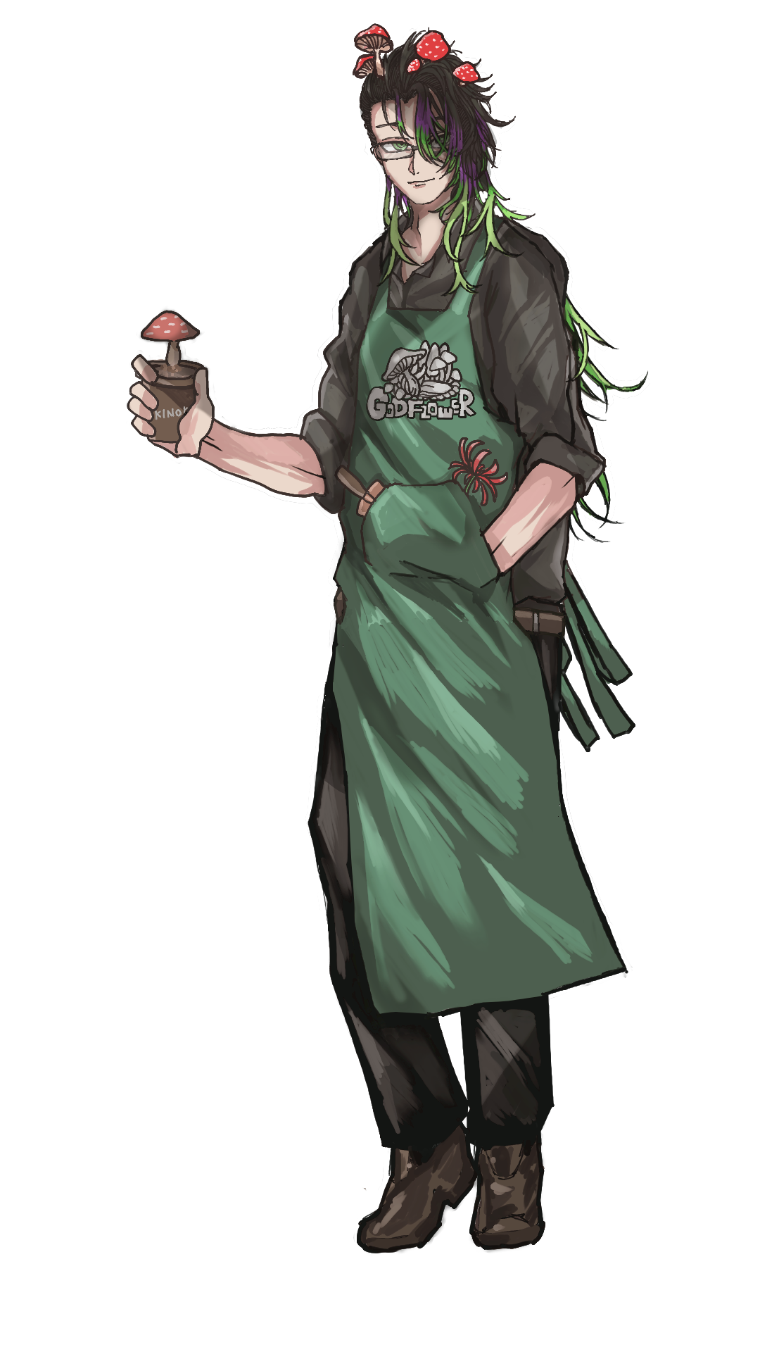 ベニテングダケが頭に生えている長身の青年。