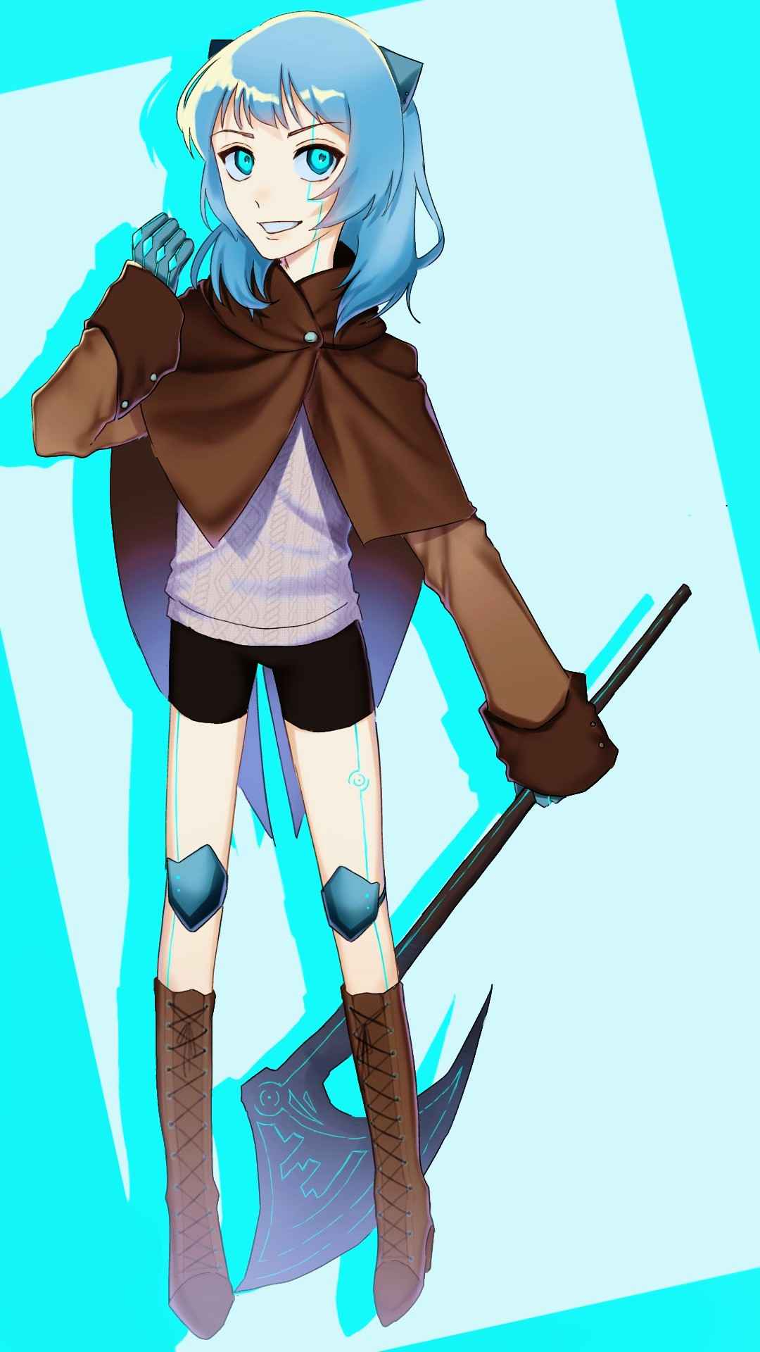 髪の色: 水色、肩までの長さでふわっとしたボリューム感がある。