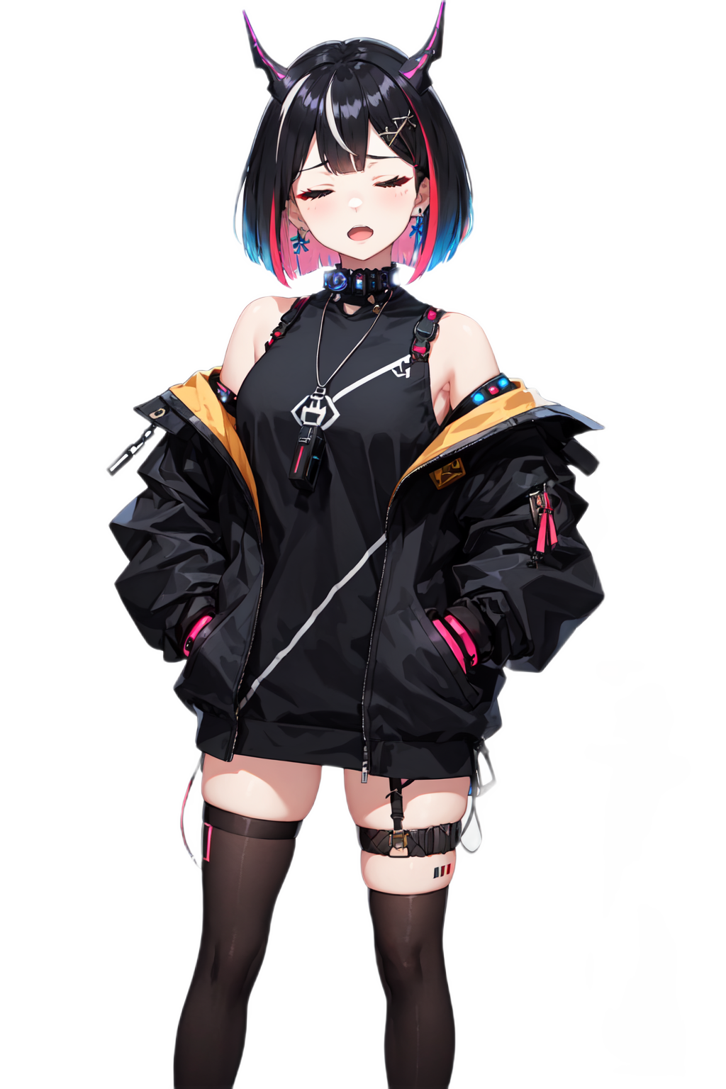 ノースリーブのインナーにオフショルダーのジャケット、ゴテゴテとした装飾に極彩色に彩られた頭髪。それらに似合わず、常に困り顔を浮かべています。服装の突飛さに対して非常に常識的な人物であり、破天荒な人物の手綱を握るのに苦労している姿がよく目撃されます。必要に迫られて様々な家事を担当している関係上、意外と家庭的な一面もあります。性格としては非常に理知的かつ冷静であり、魔術の研究者として活動する事もあります。