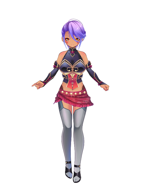 自分の身の軽さに絶対の自信を持っている戦舞士。その速さを表彰して脚を中心に刻まれた入れ墨も自慢であり、下半身には小さな腰布と太陽の意匠に合わせた赤い石のアンクレット、足先の動きを阻害しないサンダルだけを身に着けていた。