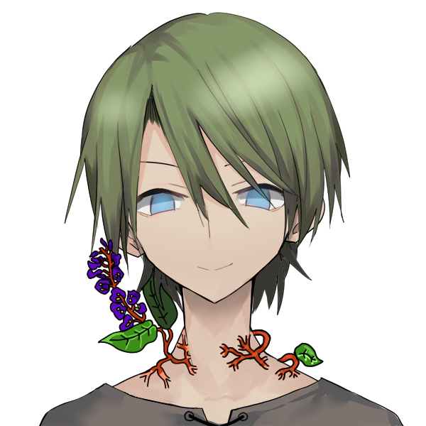 褐色肌のメリア(長寿)の好青年。肩から「ハーデンベルギア」の花を咲かせている。