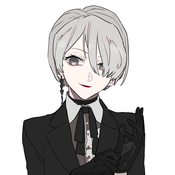 髪はグレージュでショートカット。瞳は少し赤みのあるグレー(赤白橡 d7a98c)。