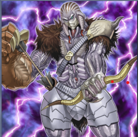 遊戯王の暗黒界の狩人ブラウ。こちらでは弓を持っているが、そんなことはない。スノウみたいな杖を持っている。絵では割とムキムキだが、肌は灰色がかっており、痩せている。