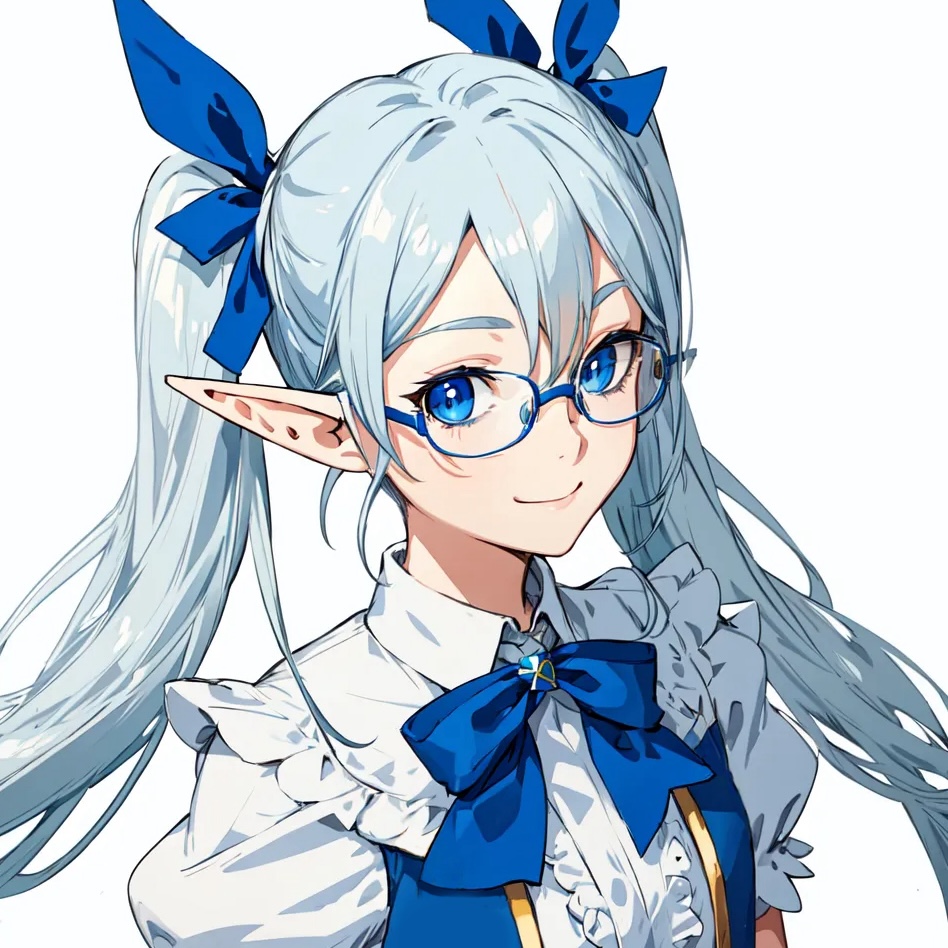 銀色の髪、青い目、眼鏡、青いリボンのツインテール、華奢な体つき、処女、メンタルが弱い。