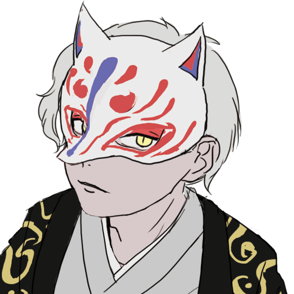 シャドウ特有の灰褐色の肌に白い髪を持ち、狐面と着物を身につけている。