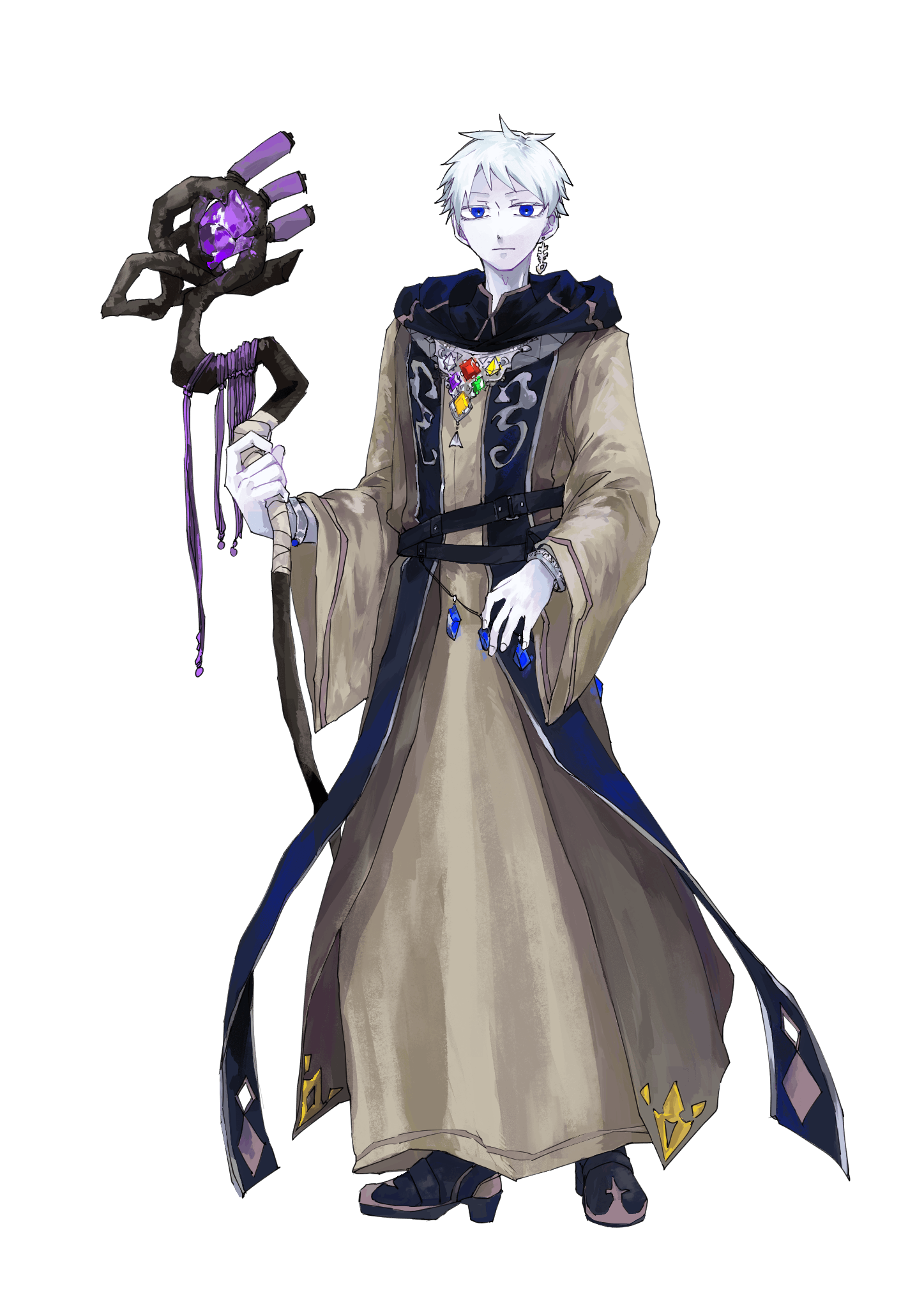 古めかしいローブを身に纏い、紫色の宝石の嵌まった杖を持つ魔術師の男。