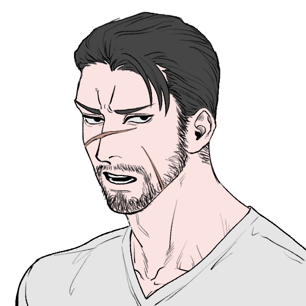 顔に大きな切り傷が何本か。近寄りがたい印象を受ける。体も生傷が絶えない。筋骨隆々。髭面。