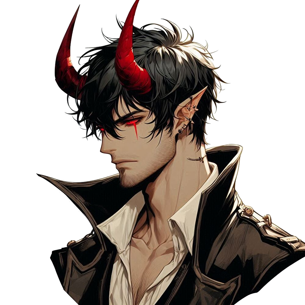 黒い髪に赤い角で、目がとにかく赤いイケオジ。
