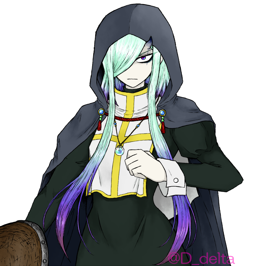 ナイトメア特有の角は左側の額に1本あり、人前ではロングマントのフードで隠している。