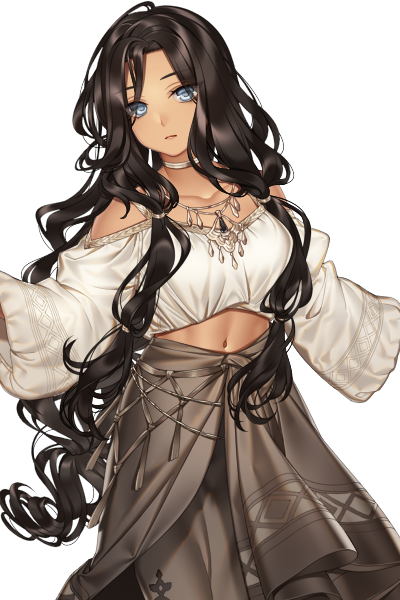服装 露出が多いだぼっとした余裕のある白い服に黒茶のロングスカートを好んで着用。踊りを踊るときは紫を基調とした踊り子の服に身を包む。