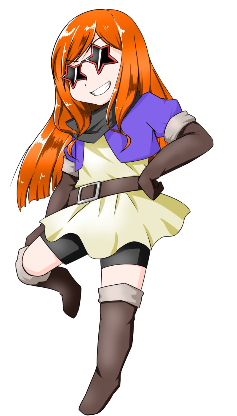 腰まで届く碧色の長髪、活発そうな赤色の瞳、サングラス。