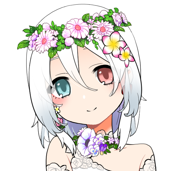 白い髪と薄めの赤と青のオッドアイが特徴