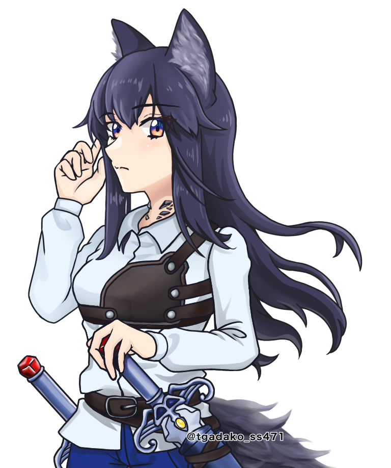長い黒髪のリカント。基本的に肌の露出が少ない長袖の服を好んで着る。