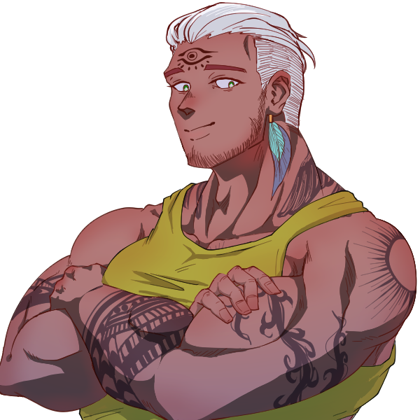 白髪と緑色の瞳、日焼けした肌、全身に刻まれた太陽を模した入れ墨が特徴のソレイユの青年。
