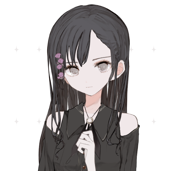 右のもみあげ、顔の横あたりに紫色の小さな花が数輪咲いていて、彼女がメリアであることを健気に主張している。